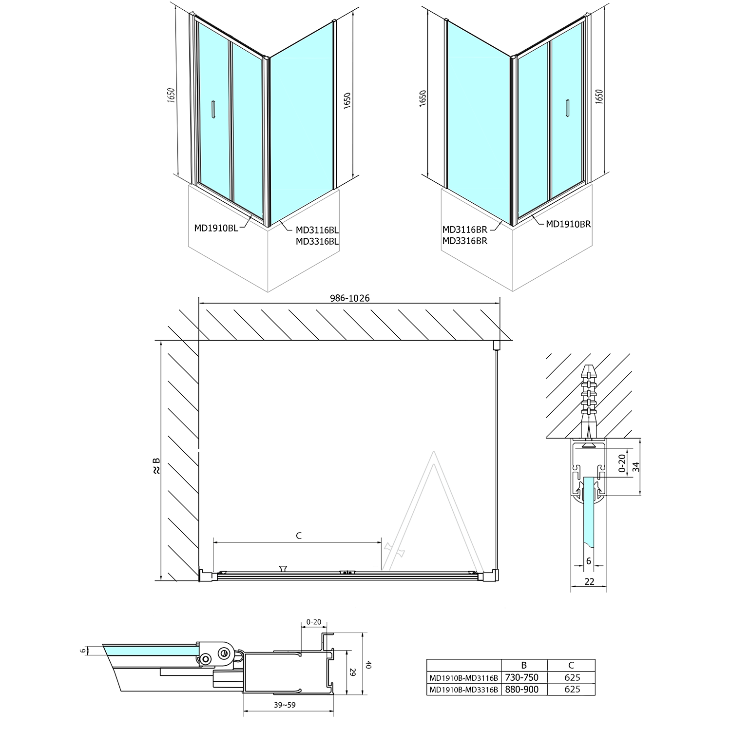 MD1616MD3116 DEEP szögletes zuhanykabin 1600x750mm, balos/jobbos,transparent
