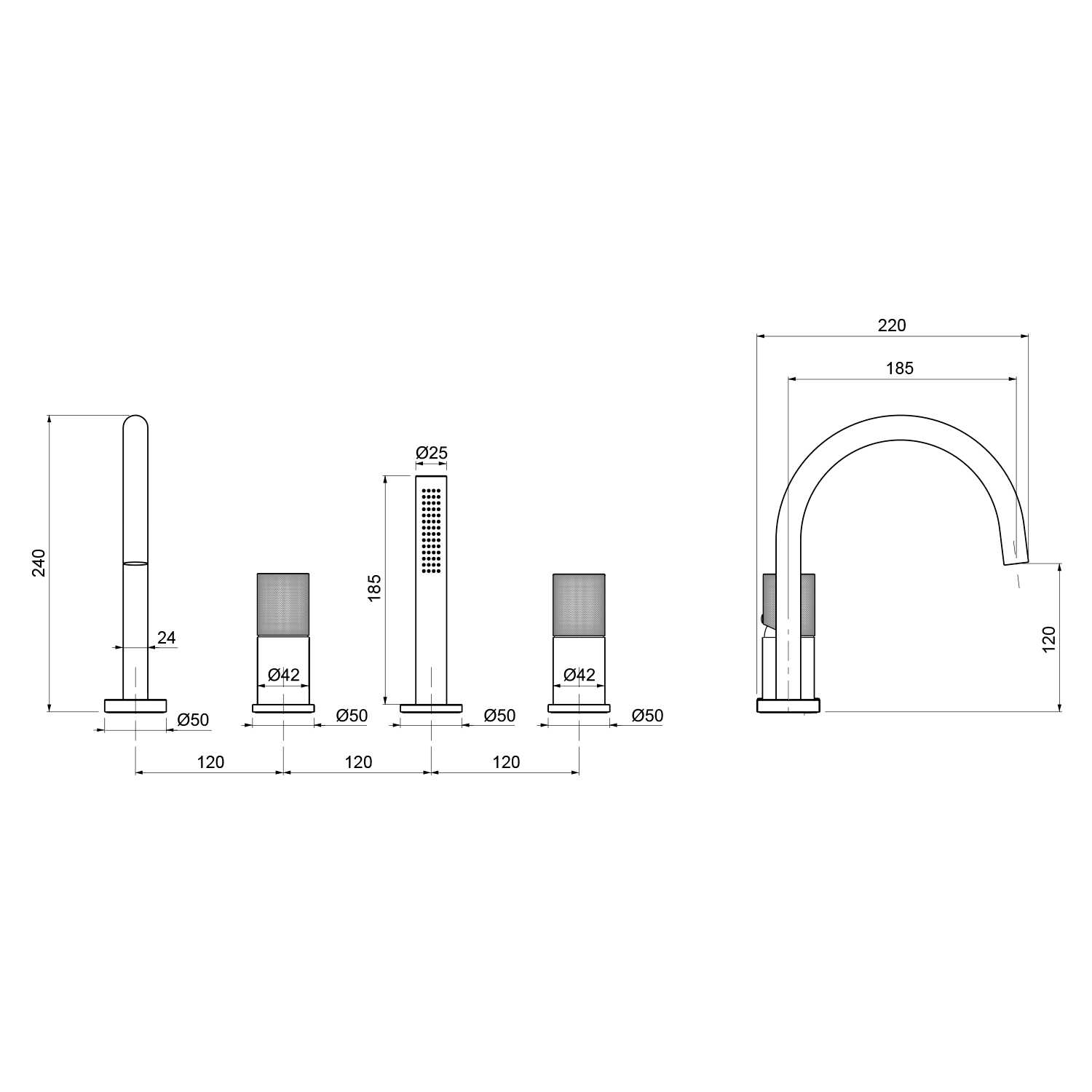 UT052TB ULTRATAP kádperemre építhető csaptelep, kifolyócsővel és kézizuhannyal, matt fekete