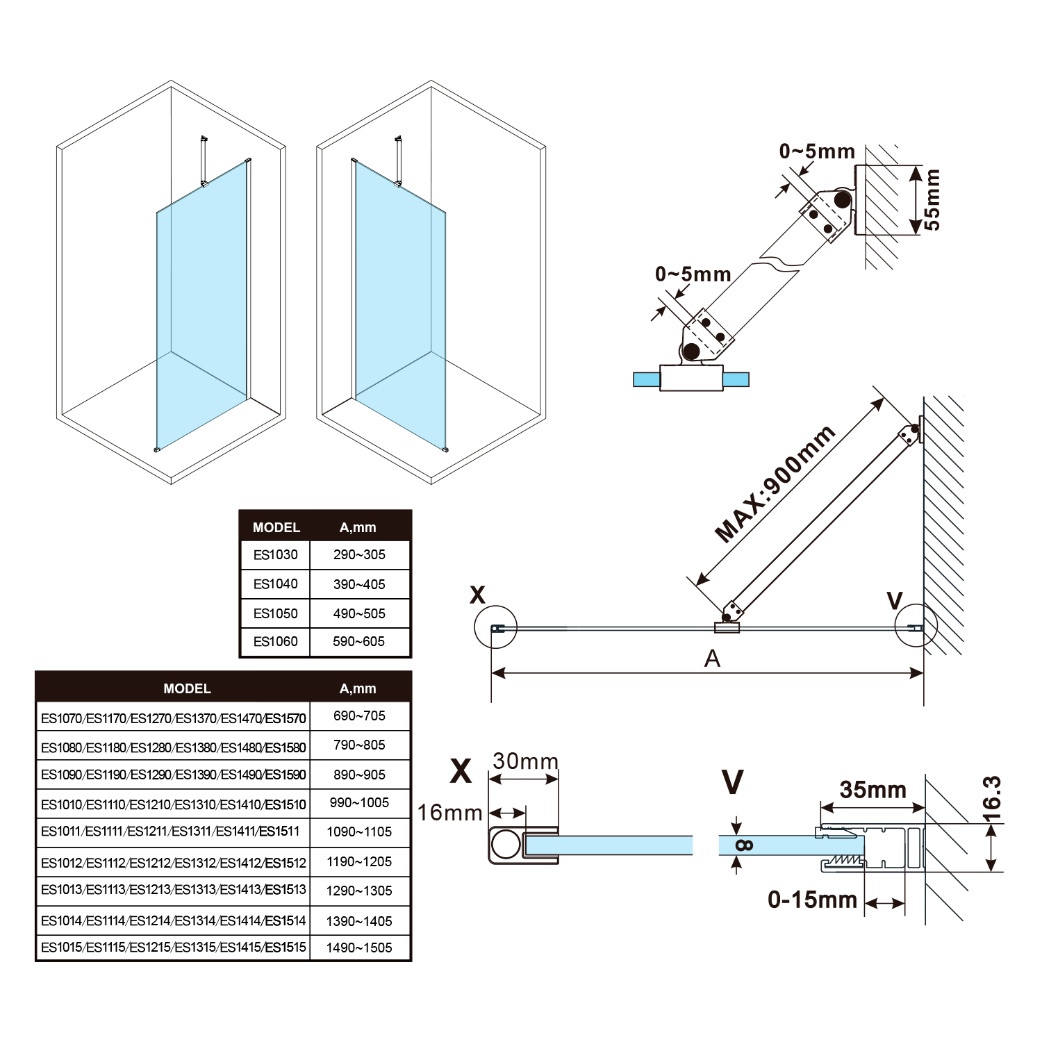 ES1490-01 ESCA CHROME Walk-in zuhanyfal, falra szerelhető, matt füst üveg, 900mm