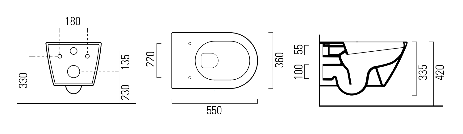 The shape of the bowl allows for efficient and effective flushing with less water, thus saving the environment and water costs. Flush saving can be used with a flushing mechanism (in the cistern of a close coupled toilet or the concealed cistern of a wall-hung toilet) whose drain valve allows water volume adjustment from 4 litres. In the case of dual flush, the small button has a volume of 3 litres and the larger button a volume of 4.5 litres.