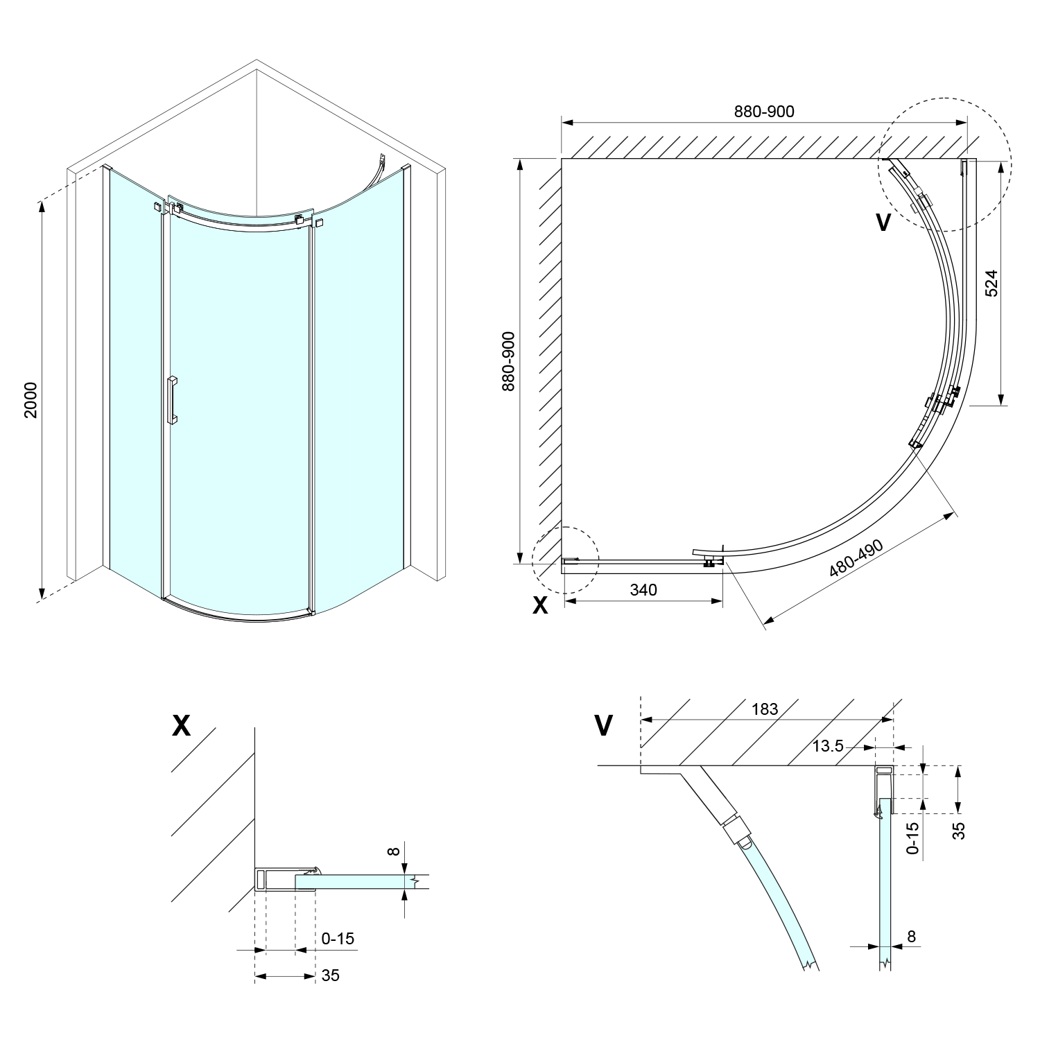 THRON ROUND čtvrtkruhová sprchová zástěna 900x900mm, čiré sklo, pravá (TL2690R-5005)
