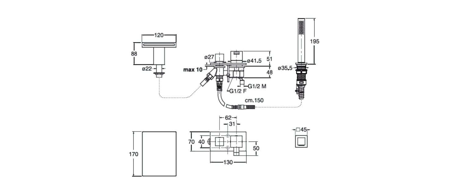 Hose extension system for mounting on the bath edge. The hand shower is returned by a return spring and the hose is dried at the same time. In addition, this system prevents water from flowing under the bathtub by means of a drain.